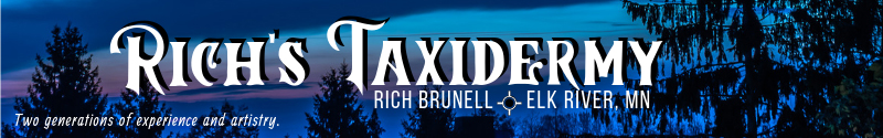 Rich's Taxidermy is owned by Rich Brunell and operated by Rich and his son Jason Brunell. Rich's Taxidermy studio is located in his home in Elk River, MN and Jason’s Taxidermy is located in Mapleton, ND on Interstate 94. Drop off at either location!